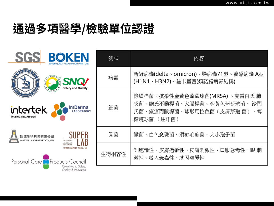 【通過檢驗認證】瑞德生物科技、PCPC、國防醫學院P4實驗室、BOKEN、SuperLab、SGS,獲得美國個人護理協會INCl認證,經國家實驗室測試,有效抑制新冠病毒(Omicron 變異株)